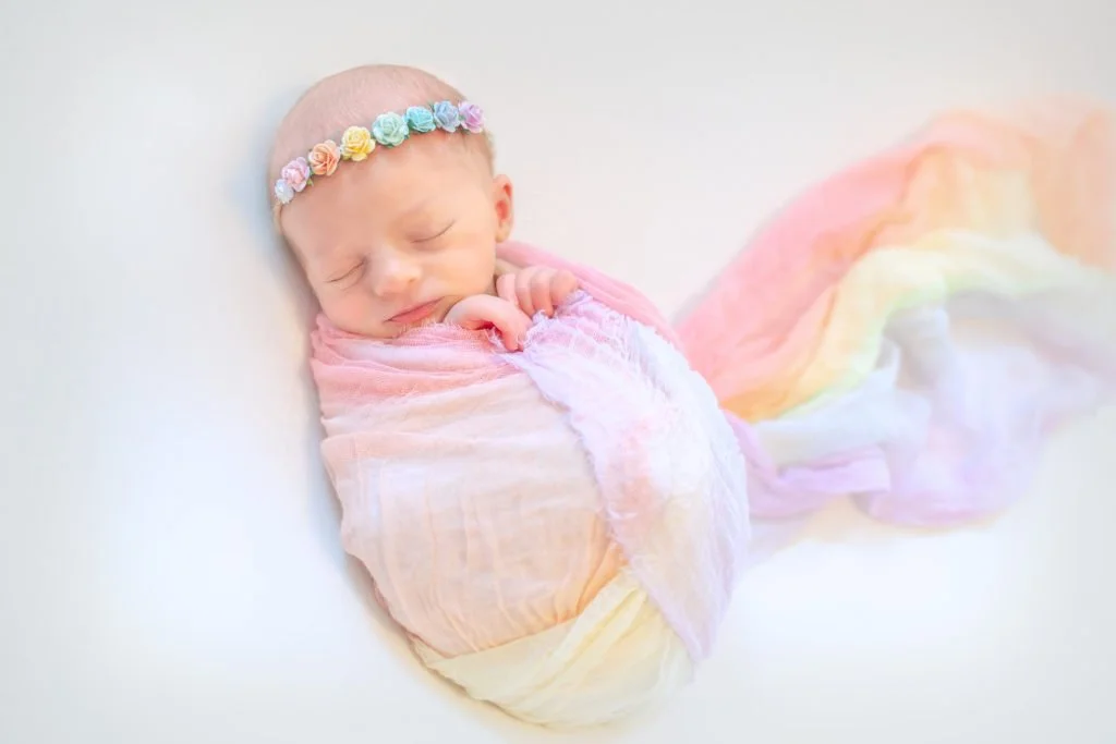 This was an incredibly touching session for me, because this Mama was so incredibly happy to have her little one. She and her husband had been trying to conceive for quite a while, and had more than their fair share of bumps along the way. So we wanted to do something to commemorate not only their newest addition, but the losses, the love and the sorrow, that came before her. Many people refer to a baby conceived after a loss as a "rainbow baby" and so we of course had to feature some soft rainbow elements in this session.