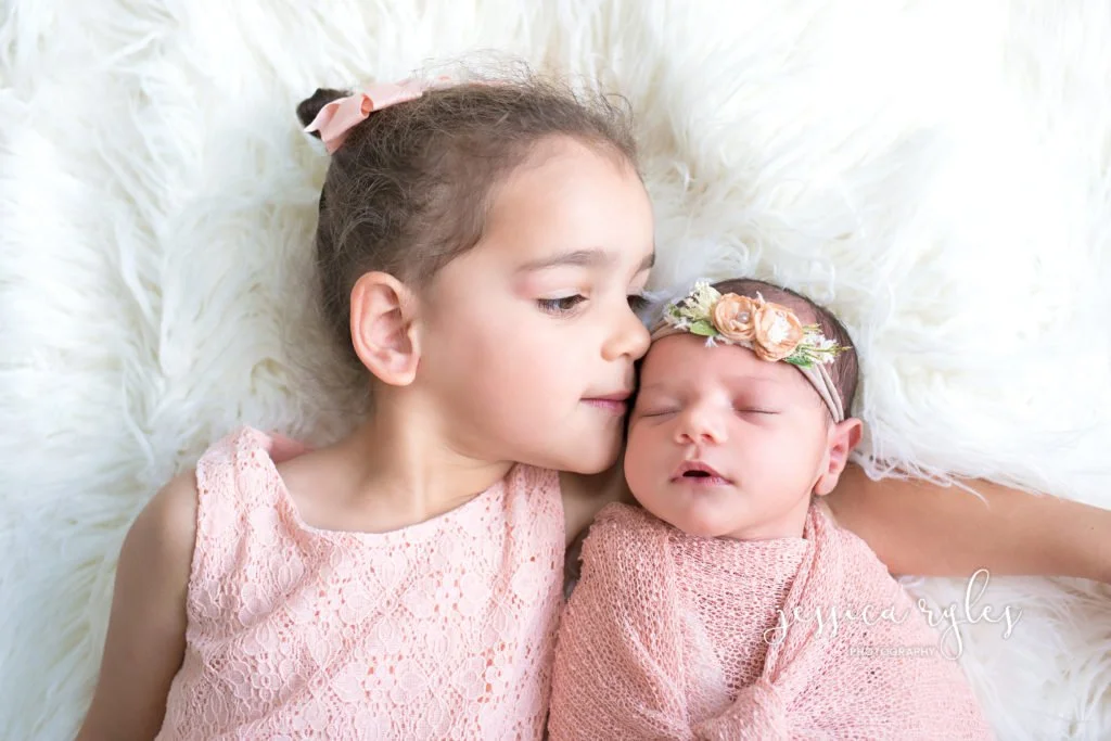 I did newborn portraits last year, and now they are celebrating their youngest's first birthday! Here is a picture of her and big sis from their newborn session last year!