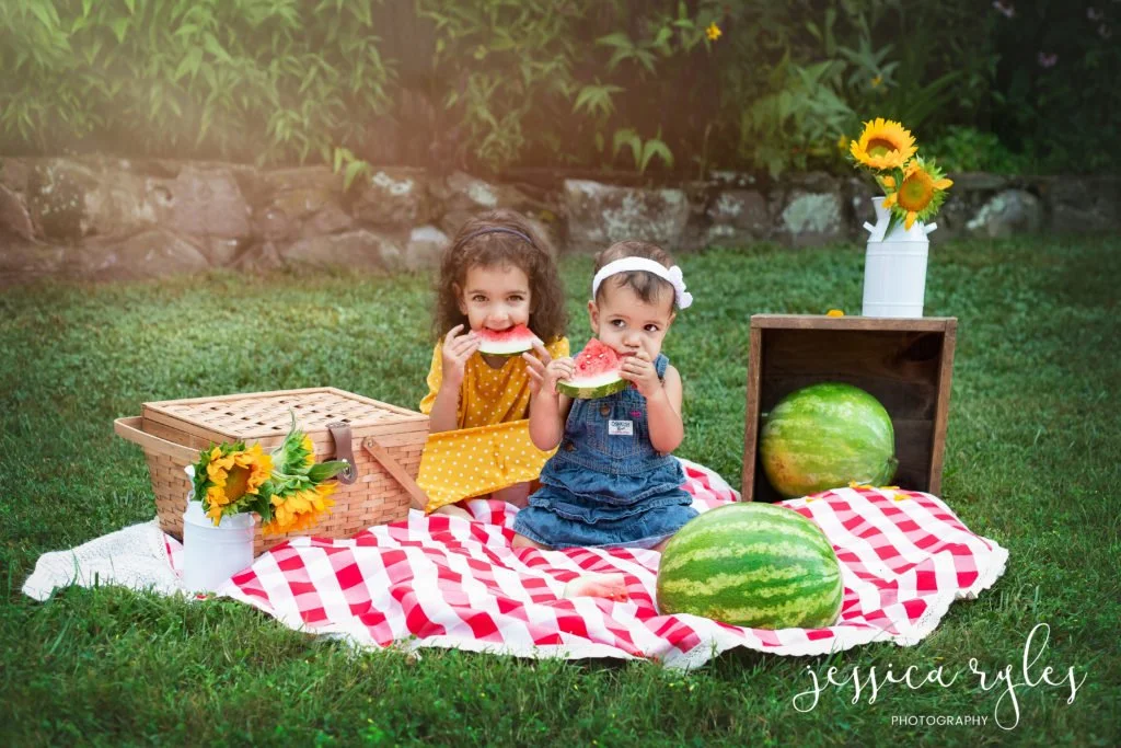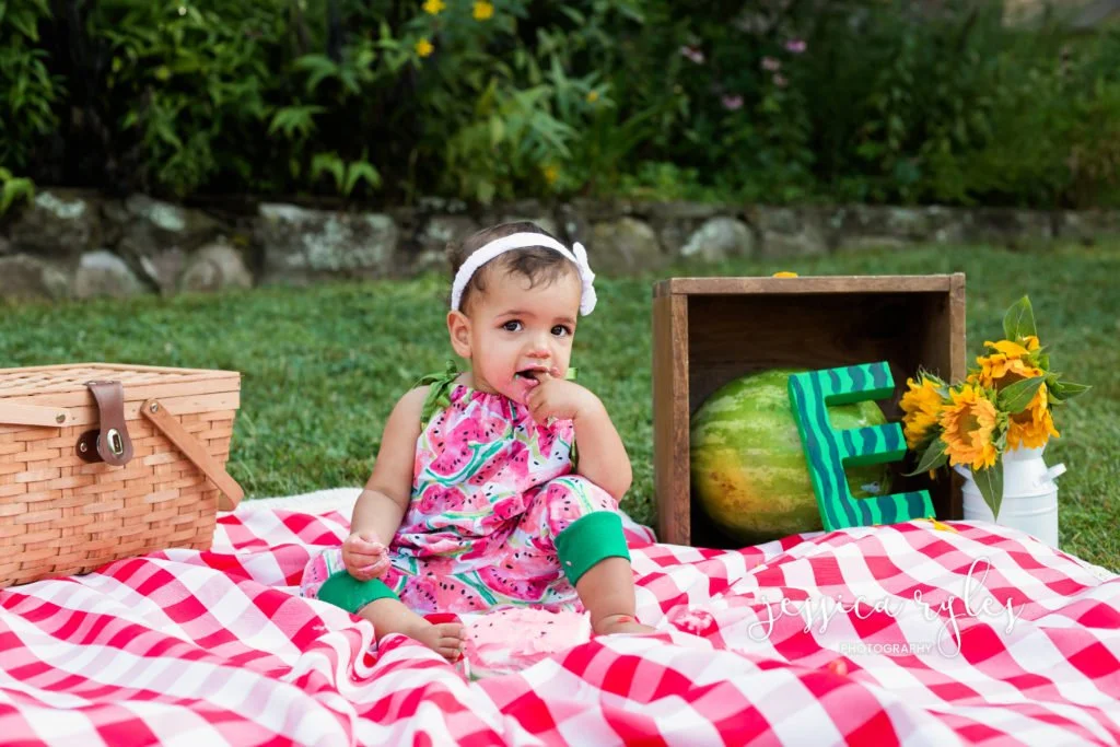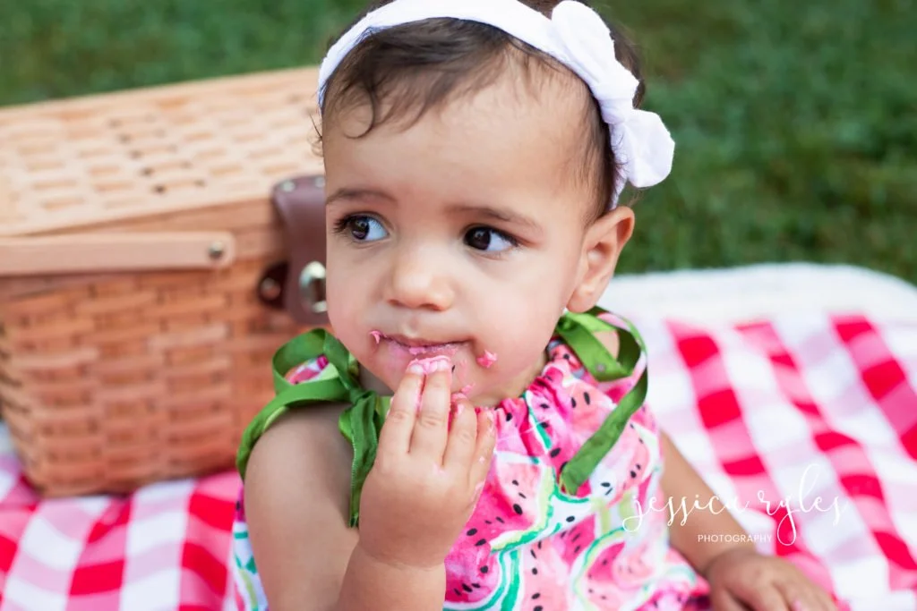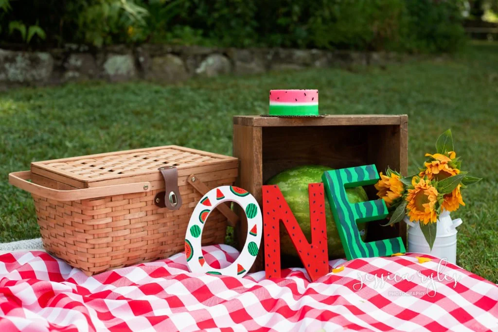 For the Watermelon cake smash, I found a cute checkered blanket, and a picnic basket, along with some white milk jugs. I added in a few sun flowers just to give it an extra boost of color. Mom actually painted the "ONE" sign herself! (I am so jealous of anyone with that sort of talent). The gorgeous little watermelon cake came from Sweets by E. It was obviously delicious, because both big and little sister demolished the thing!!! I can vouch for the frosting part of the cake as well, as somehow during cake smashes I always get covered in frosting along with baby, and may have licked some of the frosting off my wrist at the end.