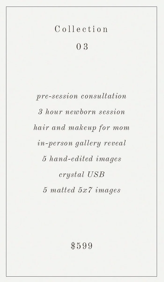 There is a $399 retainer for each session. The retainer covers your design consultation, professional hair and makeup, snacks and beverages during your session and gallery reveal, access to my newborn prop closet, and securing your date on my studio calendar. This also means that you do not have to decide until AFTER you see your images how many images you wish to purchase. I want all the families I work with to only ever purchase the images they LOVE.