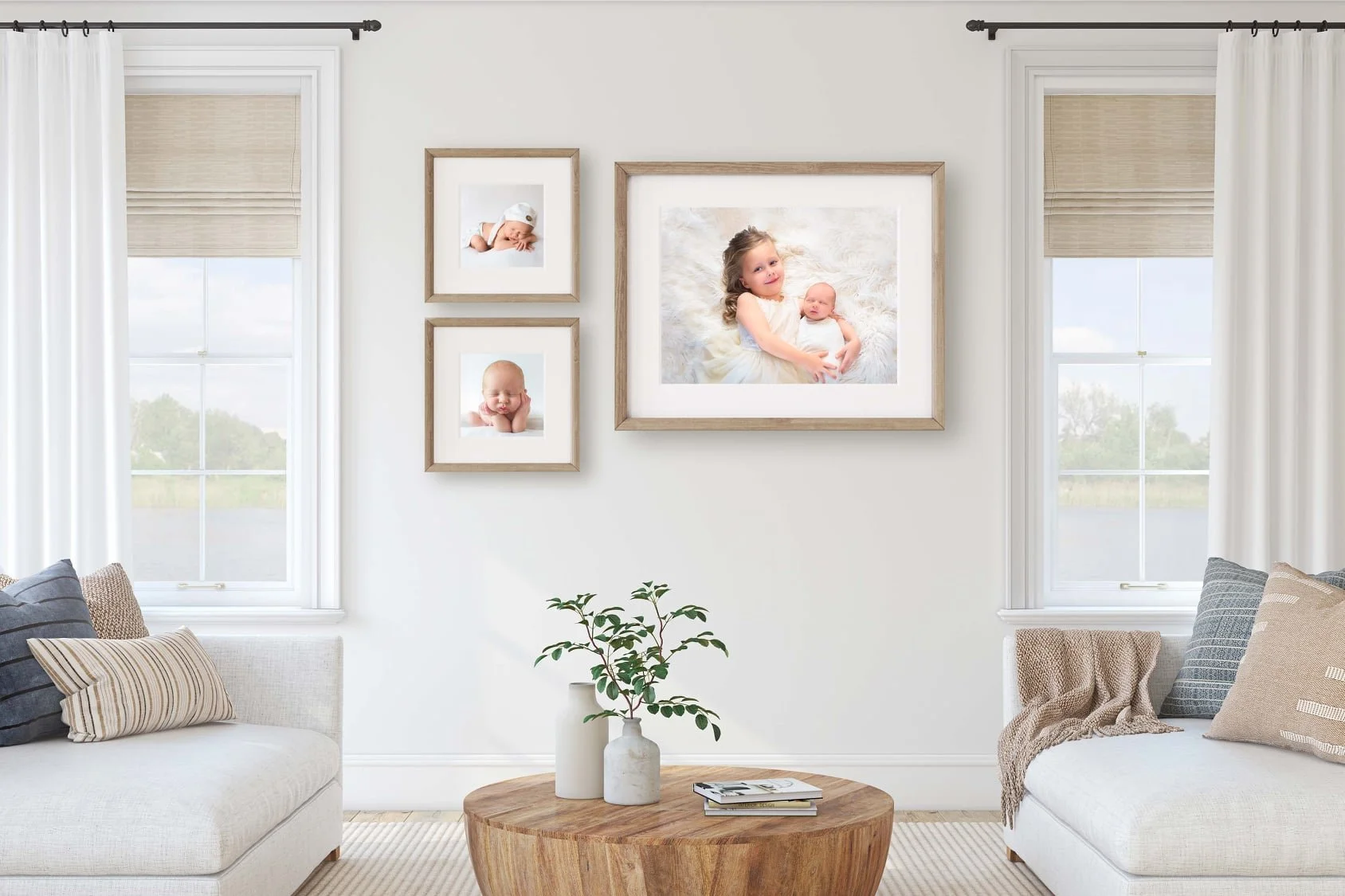 You’ll have full control to choose the digital files you’d like to own during the ordering appointment. How many or what poses you prefer is totally up to you. From there you have the option to select framed wall art or canvas to match your home decor, and heirloom albums in luxurious leather and soft linen that are custom designed to make a statement on your shelf or table. Finally, add some bragging gifts for grandparents and family afar!